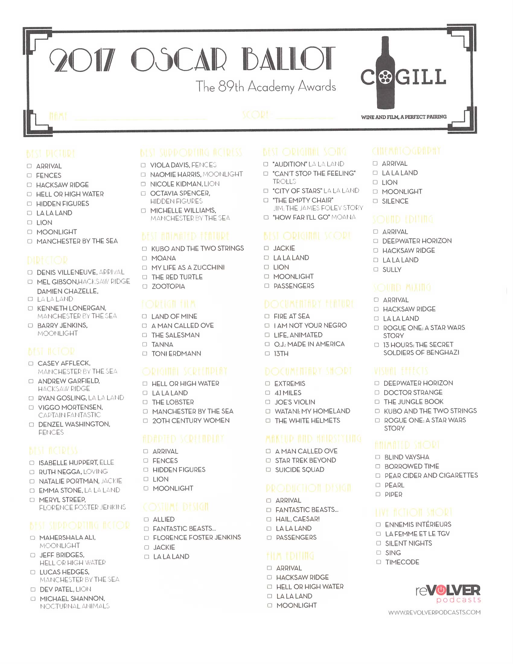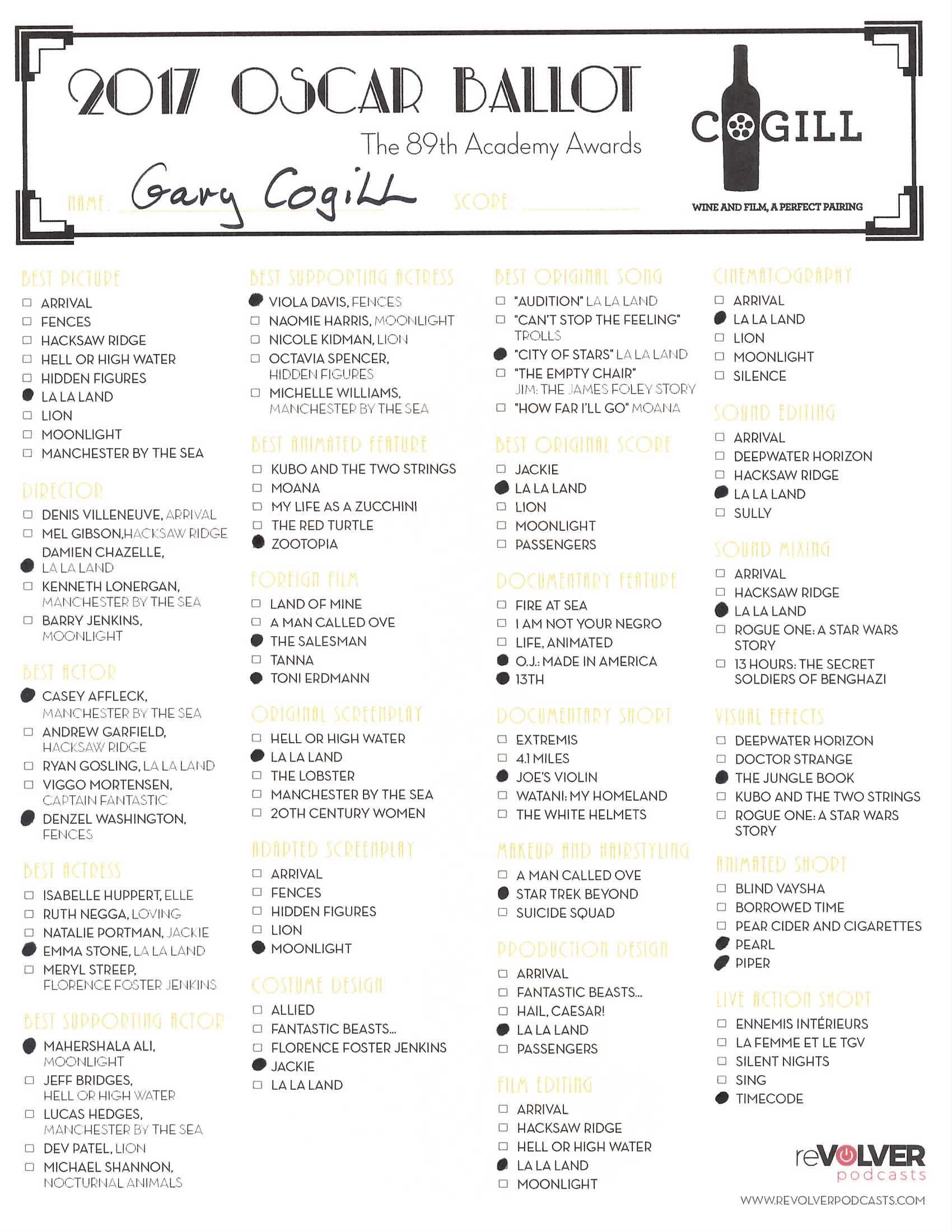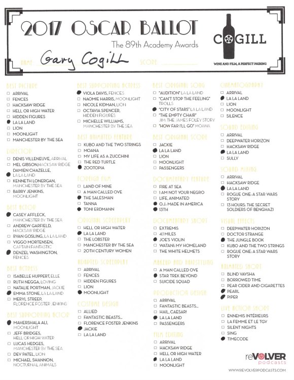We have finally arrived at Oscar weekend and this week’s “Wine and Film, A Perfect Pairing” Podcast on reVolver Podcasts we talk through the whole ballot of nominees. From best film, best writing, best sound and more, Gary gives his official predictions for who this year’s winners will be. His ballot is below for reference, along with one you can print and use to make your selections this weekend.
